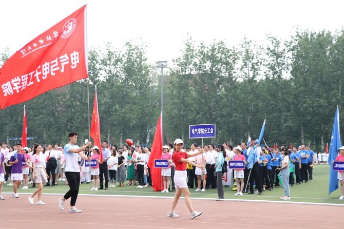 电气学院的师生们满怀喜悦的心情,以饱满的精神状态,挥动着手中的红蓝旗帜。舞蹈协会的老师们穿着鲜艳亮丽的服装,以优美动人的舞姿在方阵中心,形成一道靓丽的风景线,赢得阵阵喝彩。
