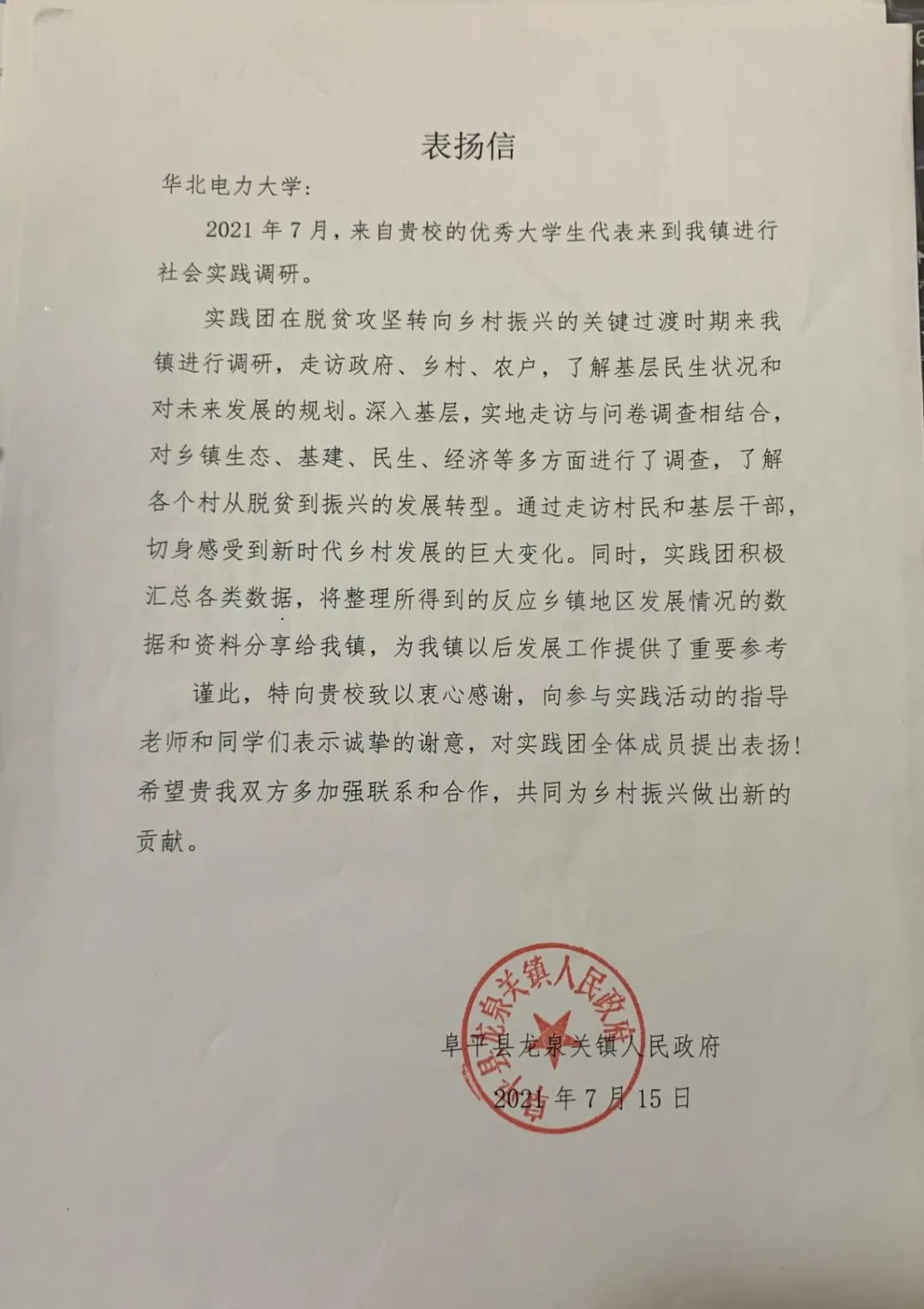 实地调研表扬信