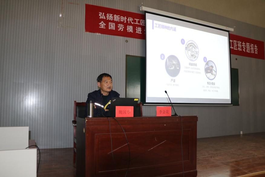 为贯彻落实《国家职业教育改革实施方案》,学习大国工匠精神,创新创业领军人才,培养并传承工匠精神,世界杯官网在线买世界杯平台特邀全国劳模魏国华先生,于2021年3月25日在6号教学楼108室为师生开展了一场以“弘扬新时代工匠精神”为主题的报告会。参加会议人员有在线买世界杯平台院长安丰金、副院长李金花,以及部分老师代表学生代表等200余人参加了此次报告会,报告会由副院长李金花主持。