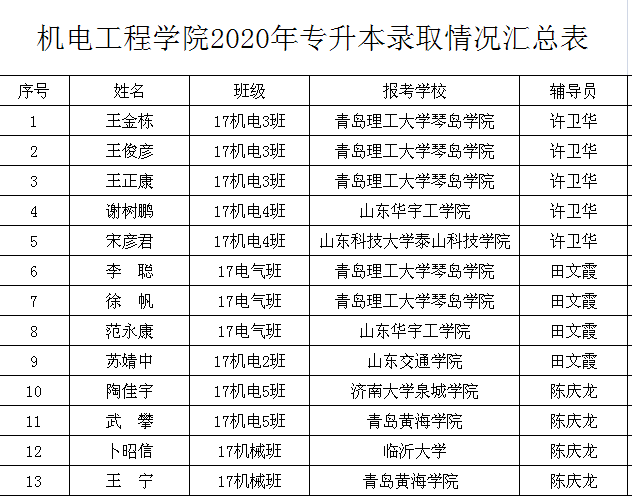 日前,山东省2020年专升本成绩揭晓。在线买世界杯平台机电工程学院2020年参加专升本考试共计28人,录取13人,录取率达46.43%。其中王金栋、王俊彦、王正康、李聪、徐帆等考入青岛理工大学琴岛学院;谢树鹏、范永康等考入山东华宇工学院;宋彦君考入山东科技大学泰山科技学院;苏婧中考入山东交通学院;陶佳宇考入济南大学泉城学院;卜昭信考入临沂大学;王宁、武攀等考入青岛黄海学院。