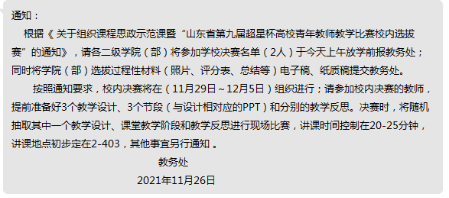 2021年11月26号,接到超星杯高校青年教师校内选拔赛的通知,学院领导对此非常重视,积极的组织青年教师踊跃报名,经过院内选拔,最终王灿青老师和解运超老师代表在线买世界杯平台参加此次比赛。