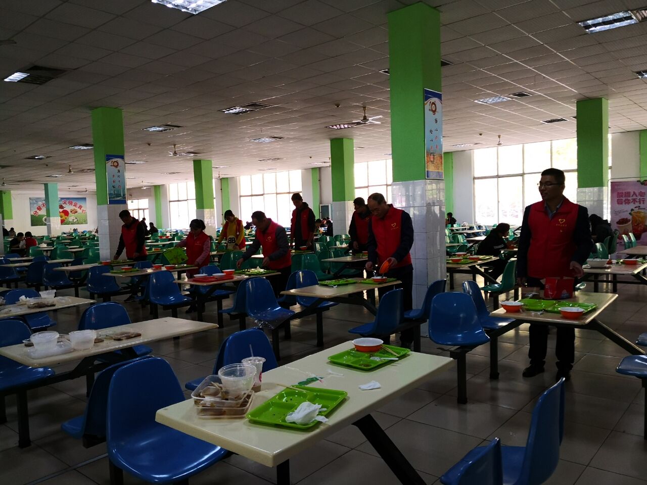 当天中午12点10分,在支部书记陈宏波同志的带领下,全体党员来到学校食堂参加志愿活动。活动中,大家不怕苦,不怕累,争先收拾食堂碗碟,用清洁球反复擦拭餐桌桌面。通过大家1个小时的辛苦劳动,食堂面貌有了很大改观。
