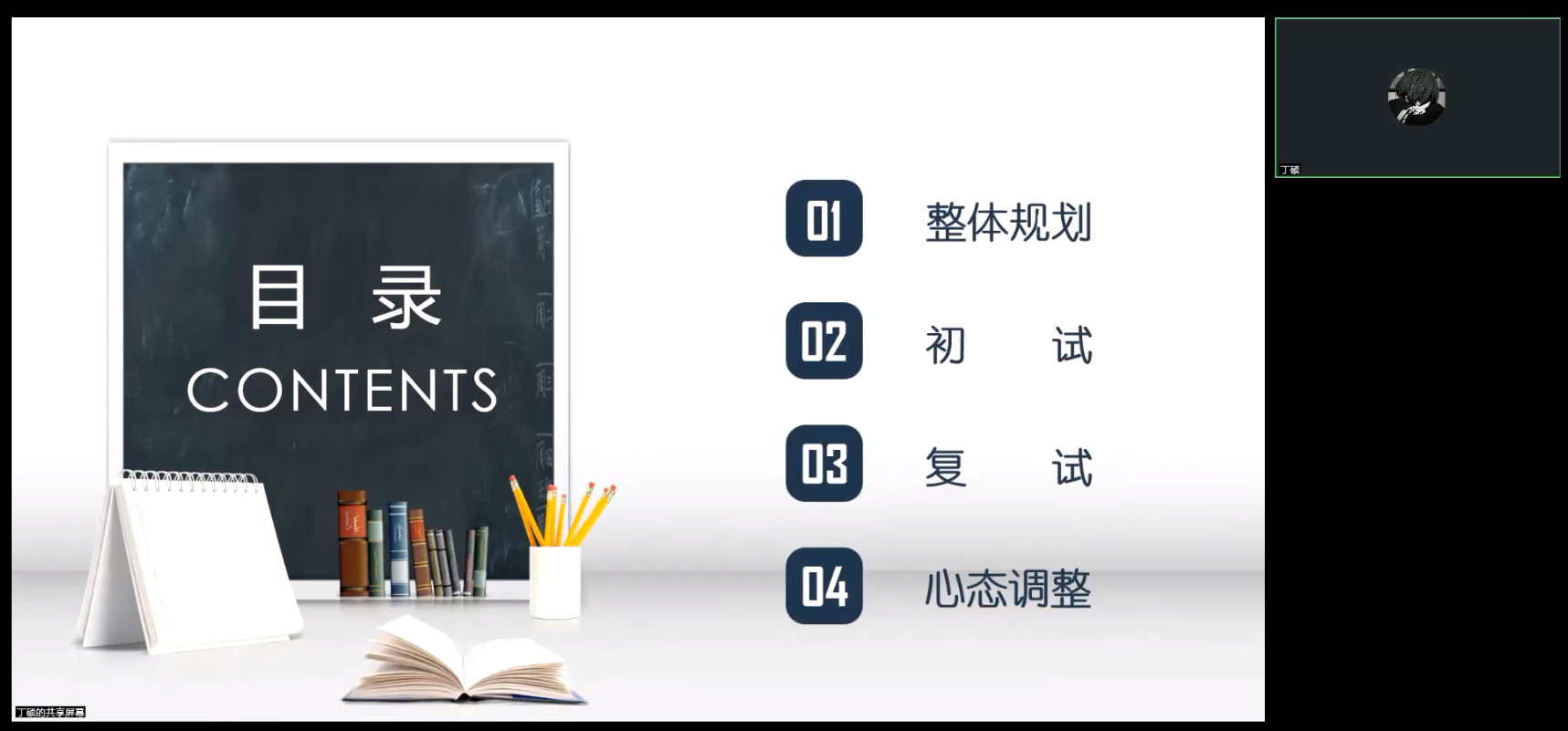 在经验分享环节,九位同学结合自身考研经历,先后围绕考研初试复试流程、备考经验、心态调整等内容向大家做了详细介绍,并就如何高效制定学习计划、如何分配各科目复习时间等备考安排给出建议。同时还就参考书籍的选择、资料信息的收集、应试技巧等同学们普遍关心的问题,全面充分地向与会同学进行了分享。