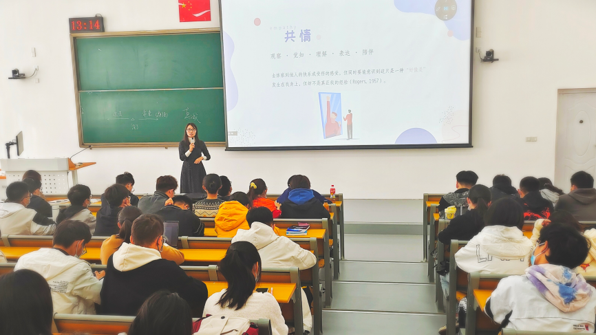 为提高学生对心理健康的重视,加深对心理健康工作的认识,10月19日中午,世界杯体育官方网站知心工作室邀请了学校心理健康中心余小霞老师,以“知心伙伴,并肩同行”为题,为同学们开展了一堂生动的心理讲座。学院全体心理委员、宿舍长以及部分教师代表,分别在教一楼12阶梯教室和线上腾讯会议参会。讲座由本科2021级辅导员张欣烨主持。