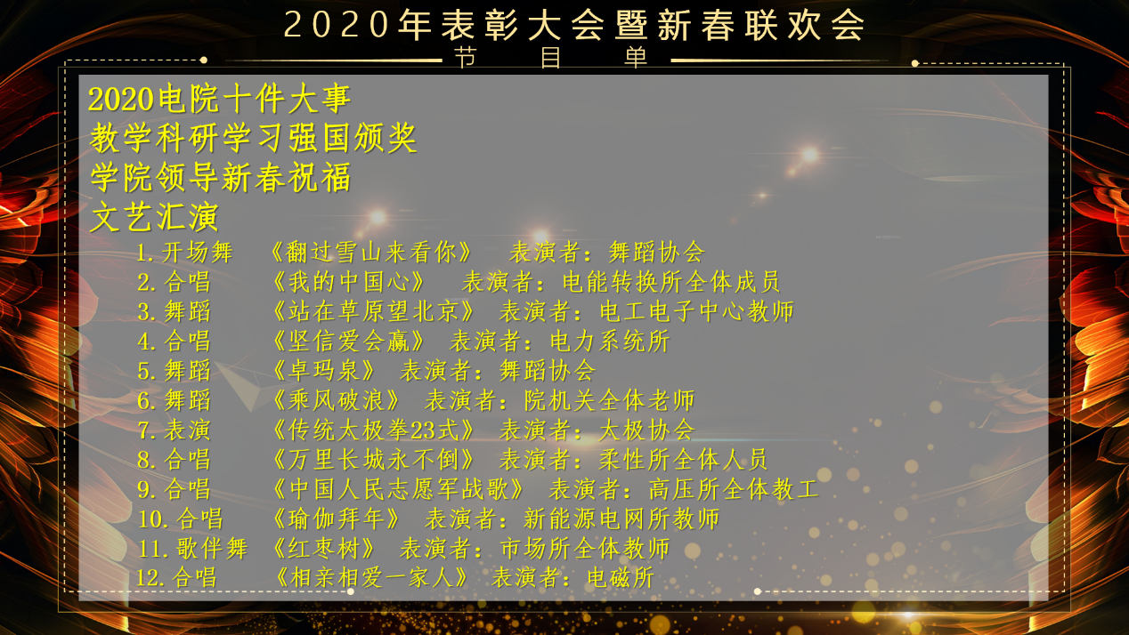 表彰大会结束后,2021年网络新春联欢会在喜庆的氛围中拉开帷幕。学院全体教职员工踊跃参与,各个研究所和文体协会提前精心录制了合唱、舞蹈、瑜伽、太极、朗诵等形式多样的文艺节目。歌声激昂滂湃、舞姿律动优美、瑜伽舒展和谐、太极张弛有度、朗诵深情感人,一个个精彩的节目展现了电气学院教职员工团结一心、积极向上、和谐友爱的精神风貌。精彩纷呈的节目将联欢会推向一个又一个高潮,直播弹幕中鼓掌、鲜花、喝彩络绎不绝、热闹非凡,仿佛置身现场一般。