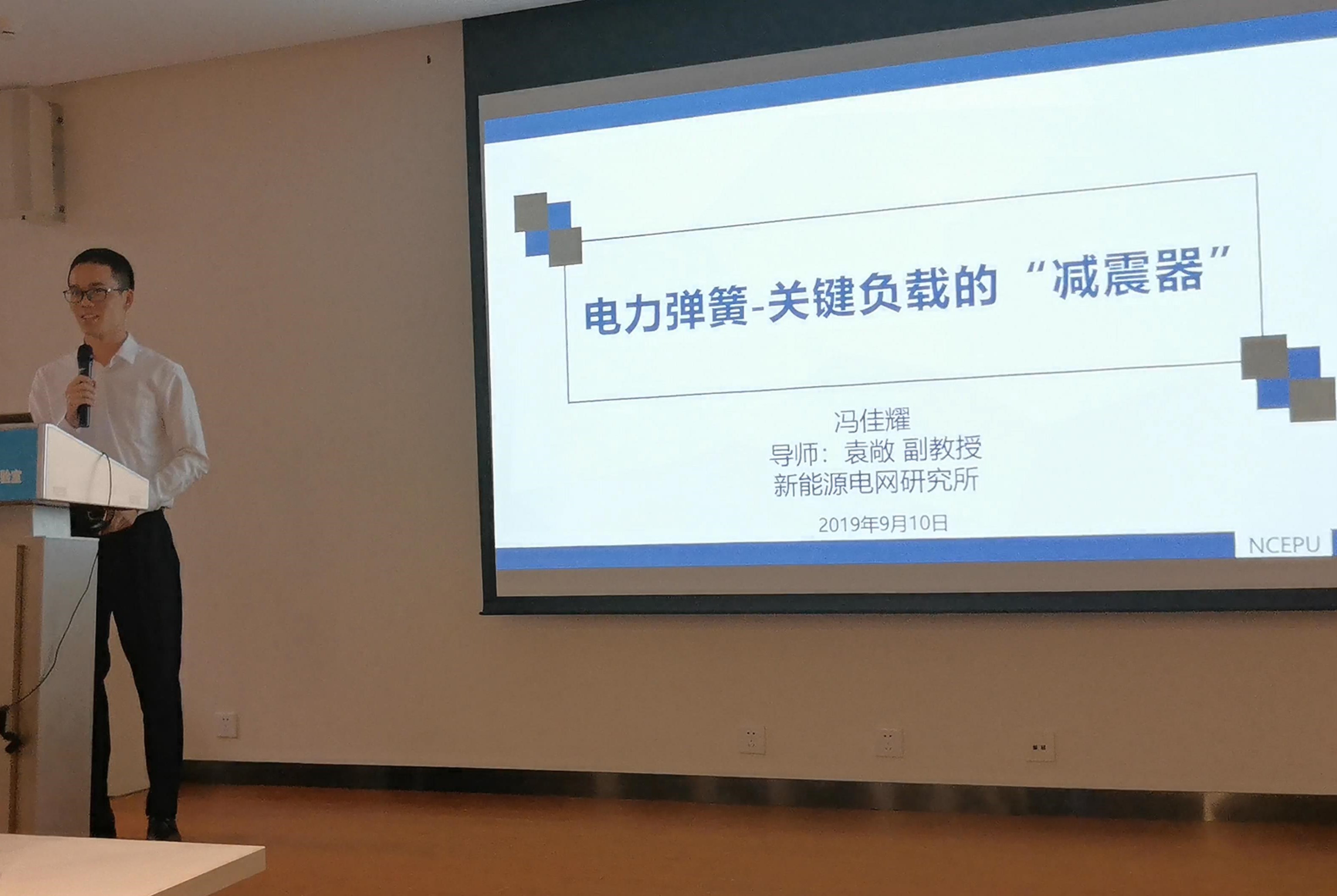 随后,师从袁敞副教授的硕士研究生冯佳耀的报告题目是“电力弹簧——关键负载的减震器”,他从“电力弹簧”的灵感来源讲起,向在座师生介绍了什么是电力弹簧,并结合电力弹簧研究现状和我国的能源背景讲述了开展这一研究课题时的突破点,并向在座师生介绍了相应的研究过程和研究成果。