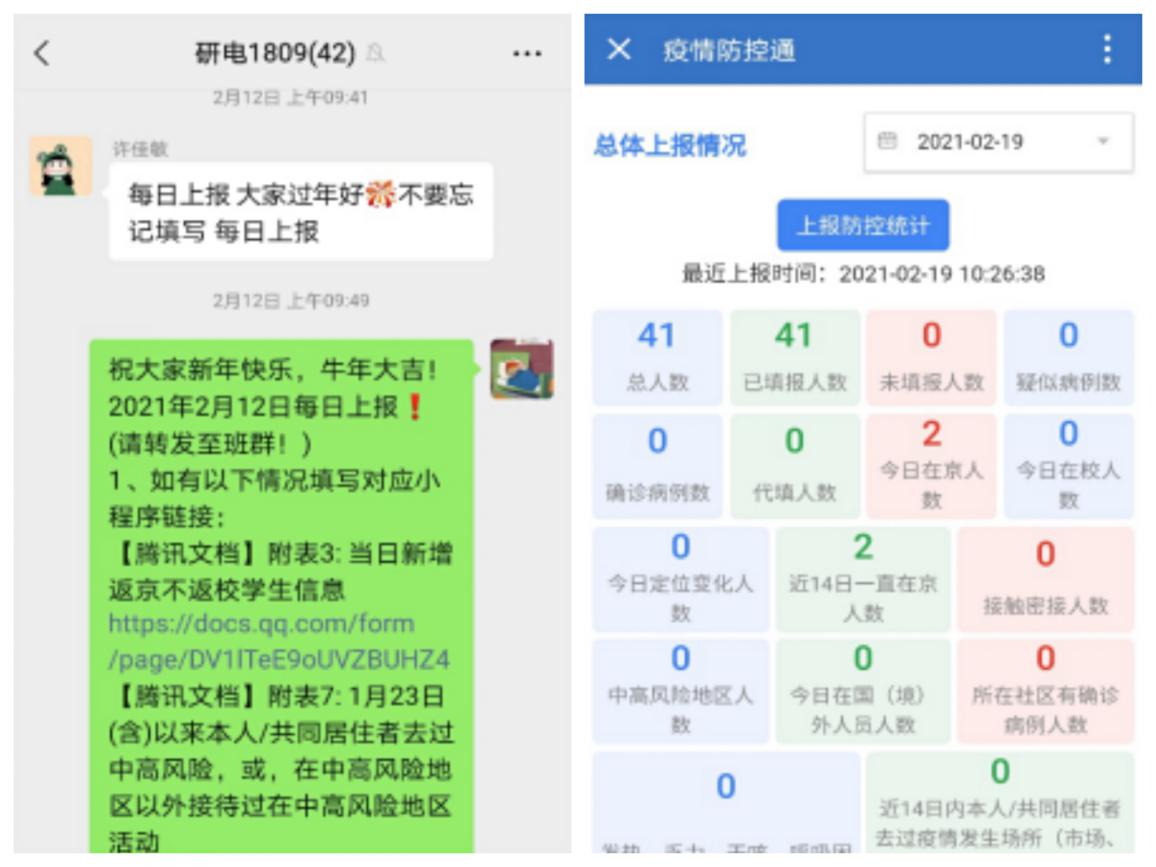 除了以耿聪为代表的工作在疫情防控前线的志愿者们,分散在全国各地的电院学子也积极配合学校和当地疫情防控工作,坚持每日上报自身相关情况,辅导员密切关注每日上报结果,进行信息整理采集,精准掌握学生假期行程轨迹及身体健康状况等信息。