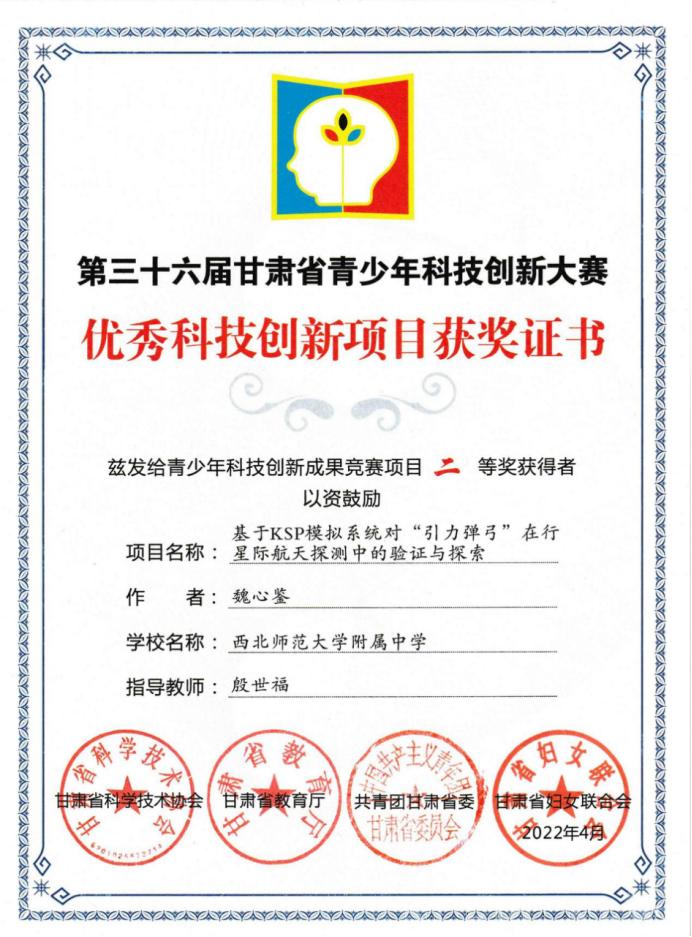 中华儿女多奇志,漫步寰宇问苍穹。魏心鉴还有着对航空航天的热爱。他深知一次次长征腾空、嫦娥落月的背后是无数科研人员的孜孜不倦、精益求精。他将这种精神化于学科探究之中,高二时看到第三十六届全国科创比赛的举办消息,他不假思索地报了名。面对科创大赛“创新度、实践度、精深度”的办赛理念,基于对航天的喜爱与相关专业知识,魏心鉴将自己的研究课题定为了《基于KSP模拟系统对“引力弹弓”在行星际航天探测中的验证与探索》。从调阅论文、查阅各国相关资料、设计测试方案、组织模拟测控网,到“引力弹弓”轨道设计、单个航天器的设计布局、发射,再到将笔下的轨道设计还原到模拟系统中、模拟各国有关探测器的变轨过程,魏心鉴全部自行完成,最后呈现出自己的课题报告并完成现场答辩,最终获评为省级二等课题。每当遇到艰深的理论或模拟中不测的意外,他也有过无从下手和迷茫彳亍。他热爱航空航天,不单单欣赏腾飞升空的绚丽和遨游天宫的浪漫,更感动于能让这些庞然大物如燕般翻飞的力量与精神。“从最小的旋翼机到偌大的空间站,工程师们能够将它们从图纸变为现实,从零件变为整体,从实验室走向空天,背后一丝不苟、尽善尽美的精神,不应该是每一个华电人应有的品质吗?”魏心鉴说出了他热衷科技创新的原因。他以华电甘肃省第一名的成绩进入世界杯体育官方网站求学。站在位居全国前列的电气专业的广阔平台上,他为能够在这里求学而感到幸福。团结、勤奋、求实、创新的华电校训与航天精神交相辉映,相信他在接下来的华电求学路上能够将这些精神化作实践,创造充实美好的华电青春。