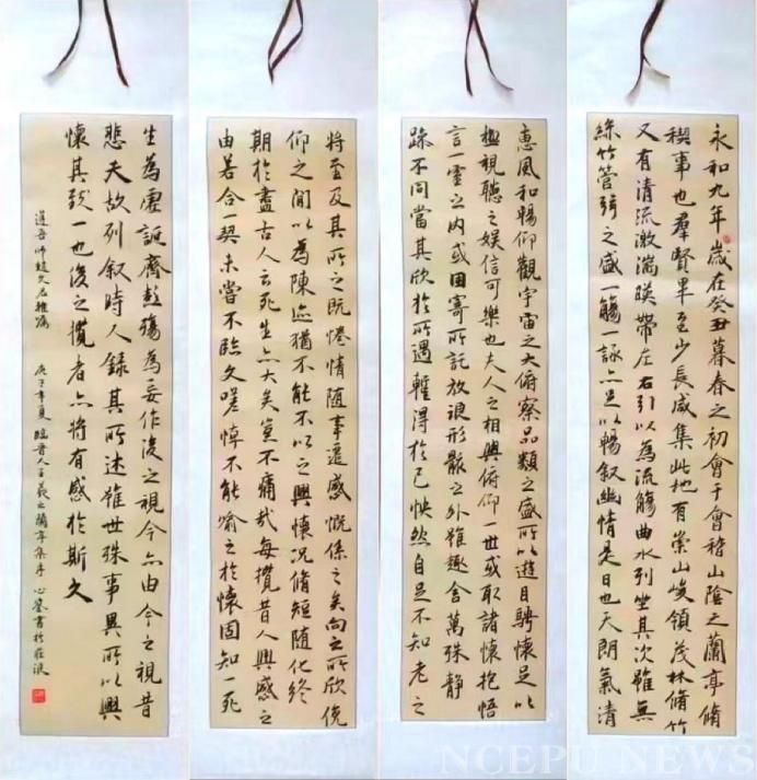 以书立心,以画蕴志。书画的种子自幼在魏心鉴的心中埋下。小时候他便在父亲的熏陶下对书画产生浓厚的兴趣。成长过程中父母的建议,老师的指导,以及自己的不倦尝试、体悟与练习,才让他的书画能够由形到骨,由骨到神,到现在的阅来干练,观来清爽。他的书架上有《曹全碑》《吴均帖》《多宝塔碑》《智永千字文》《兰亭集序》等等碑帖资料,篆隶楷行各样书体都为他所磨炼。说到多年体悟后对于书画的理解,魏心鉴眼光一亮:“我理解的书画讲求静、精、境、谨,无论书画还是做事,静能够让我宠辱不惊,冷静分析;精能够让我精益求精,力求至好;境能够让我屏蔽杂音,别有心境;谨能够让我谨于学科,不留漏洞。”书画对他来说,已经不单单是一项技能,而更像是汲取源头活水的一眼清泉,让他在今后的学业、科研亦或是生活中能够有更多的见解与思考。