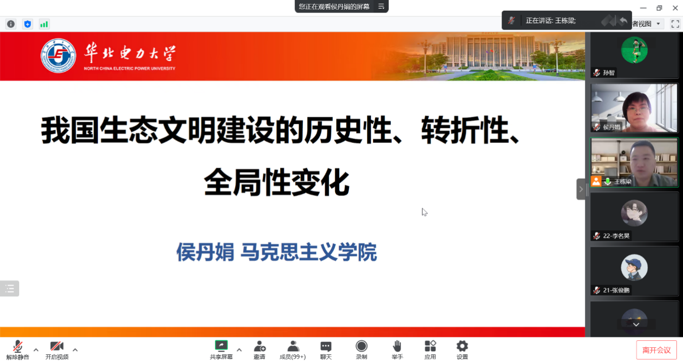 12月29日,世界杯体育官方网站举行党的二十大精神理论辅导报告会。会议邀请马克思主义学院侯丹娟副教授作“我国生态文明建设的历史性、转折性、全局性变化”专题报告。学院全体辅导员、兼职辅导员、“双百班”成员、各年级学生党员骨干等180余人在线学习。会议由学院党委副书记王栋梁主持。