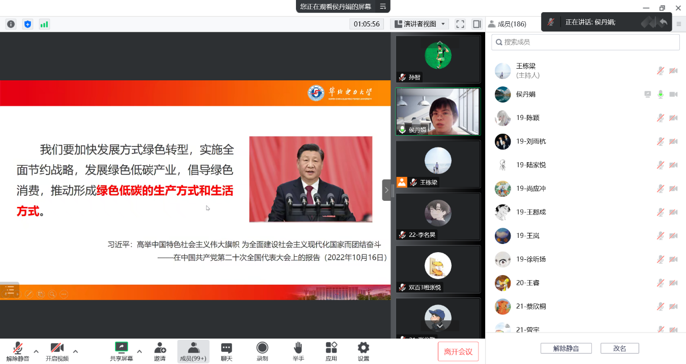侯丹娟紧扣党的二十大报告原文,深刻把握习近平生态文明思想的核心要义,从为什么要开展生态文明建设、我国怎样开展生态文明建设、生态文明建设的意义与价值等三个方面系统阐释了党的十八大以来我国生态文明建设取得的历史性成就、发生的历史性变革。侯丹娟分别从全球视角、国内视角介绍了生态文明建设面临的诸多矛盾与挑战,从国土绿化、雾霾治理、生物多样性保护、能源转型、生产生活方式变革、环境立法等6个维度介绍了美丽中国建设迈出的重大步伐,并结合学院学生的专业特点,着重介绍了我国能源结构现状及能源转型的优势与挑战。整场报告聚焦于党的二十大报告精神和习近平新时代中国特色社会主义思想研究的重大理论关切,深刻阐释了“努力建设人与自然和谐共生的现代化”的宏大立意、丰富价值和深远影响。