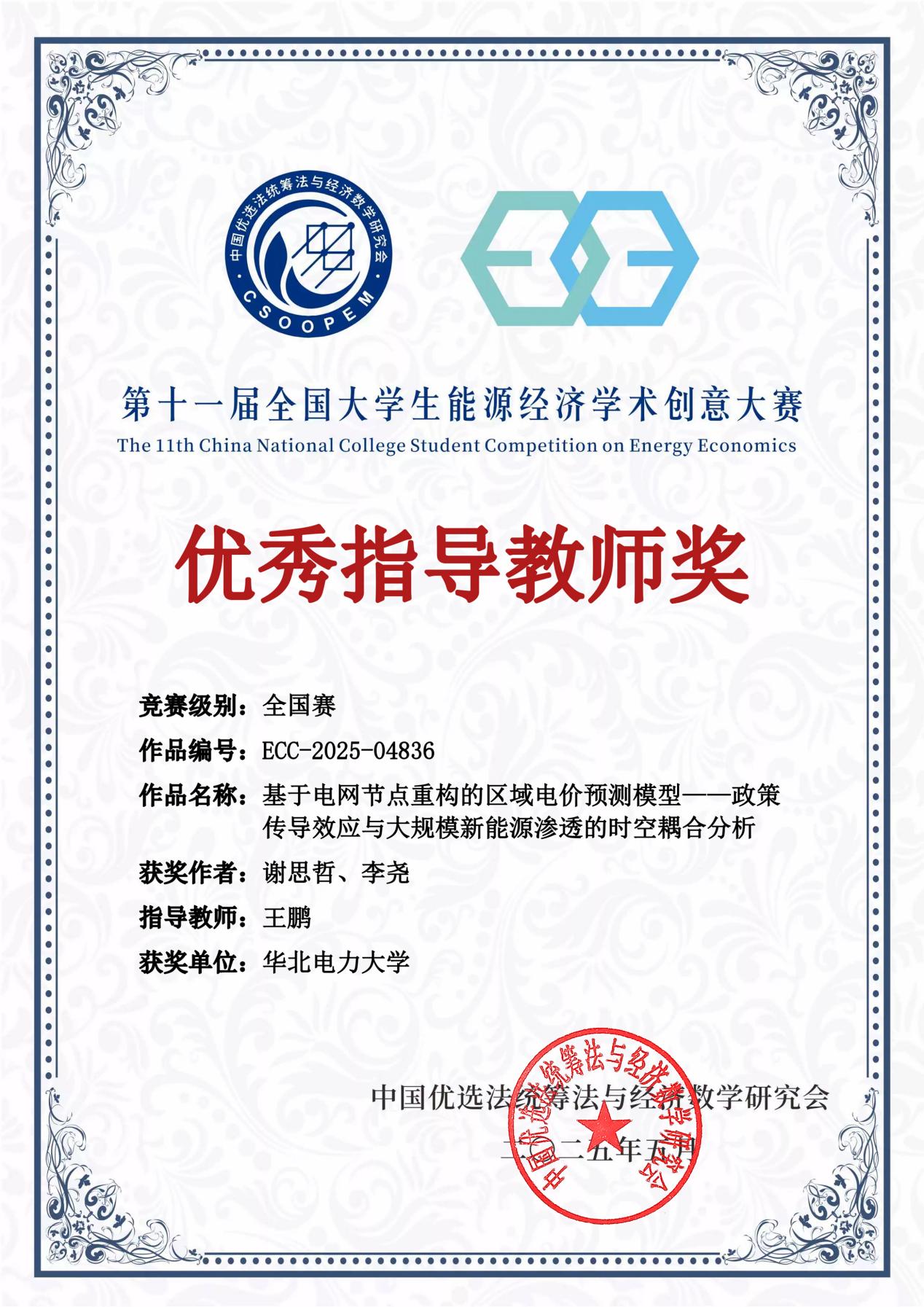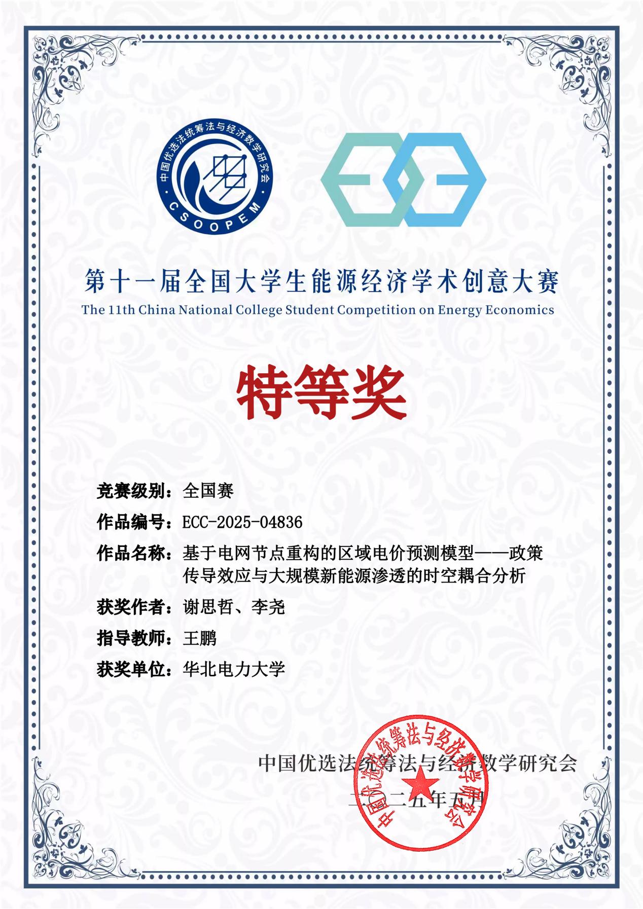 近日(5月24日),由中国优选法统筹法与经济数学研究会主办的第十一届全国大学生能源经济学术创意大赛总决赛在山西财经大学举行。世界杯官网世界杯体育官方网站本科生谢思哲、李尧团队参赛项目《基于电网节点重构的区域电价预测模型传导效应与大规模新能源渗透的时空耦合分析》荣获本科生组特等奖,王鹏教授荣获优秀指导教师奖。