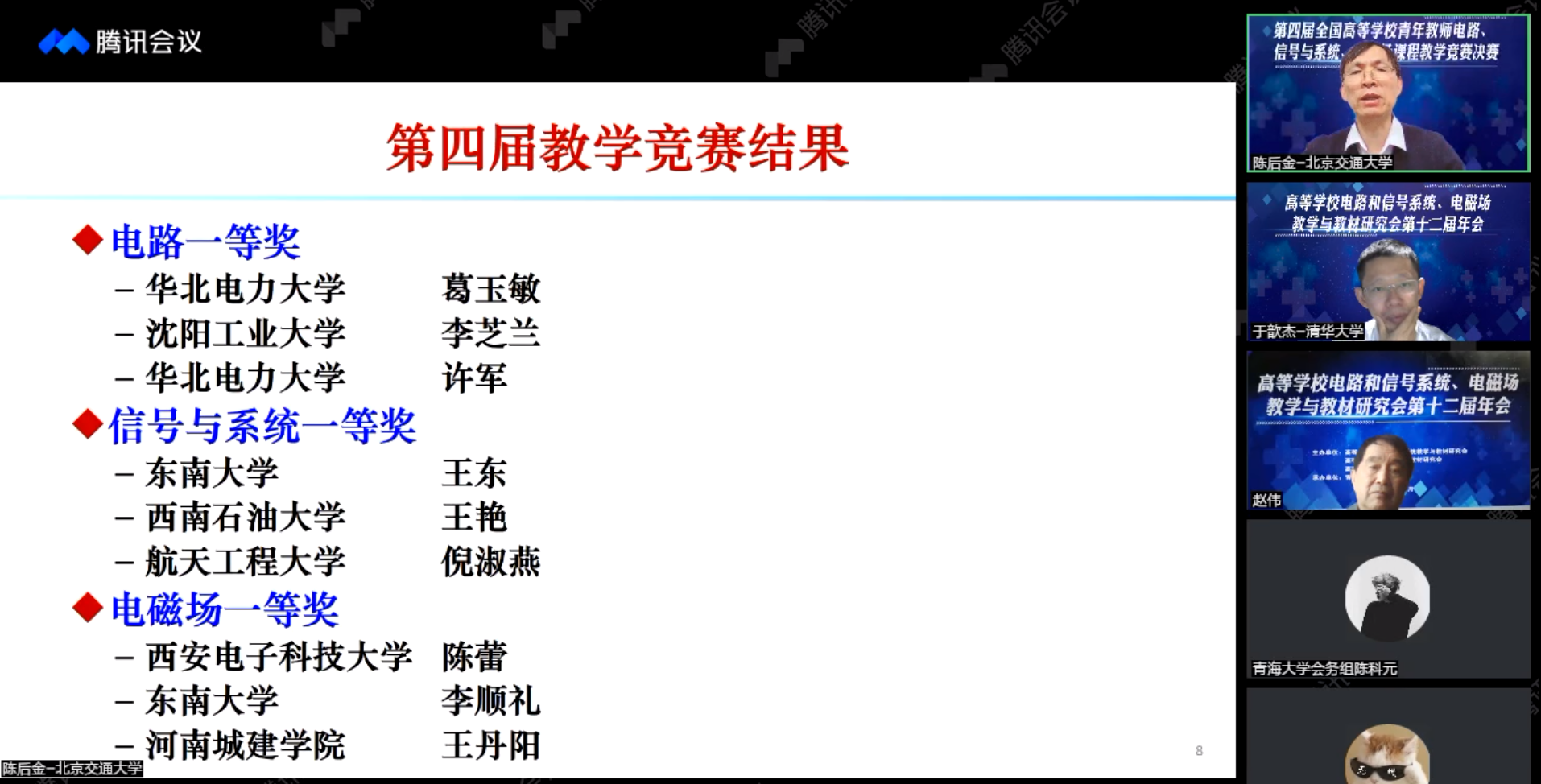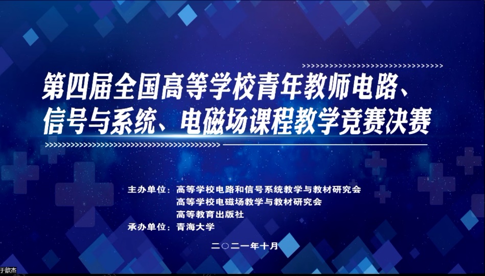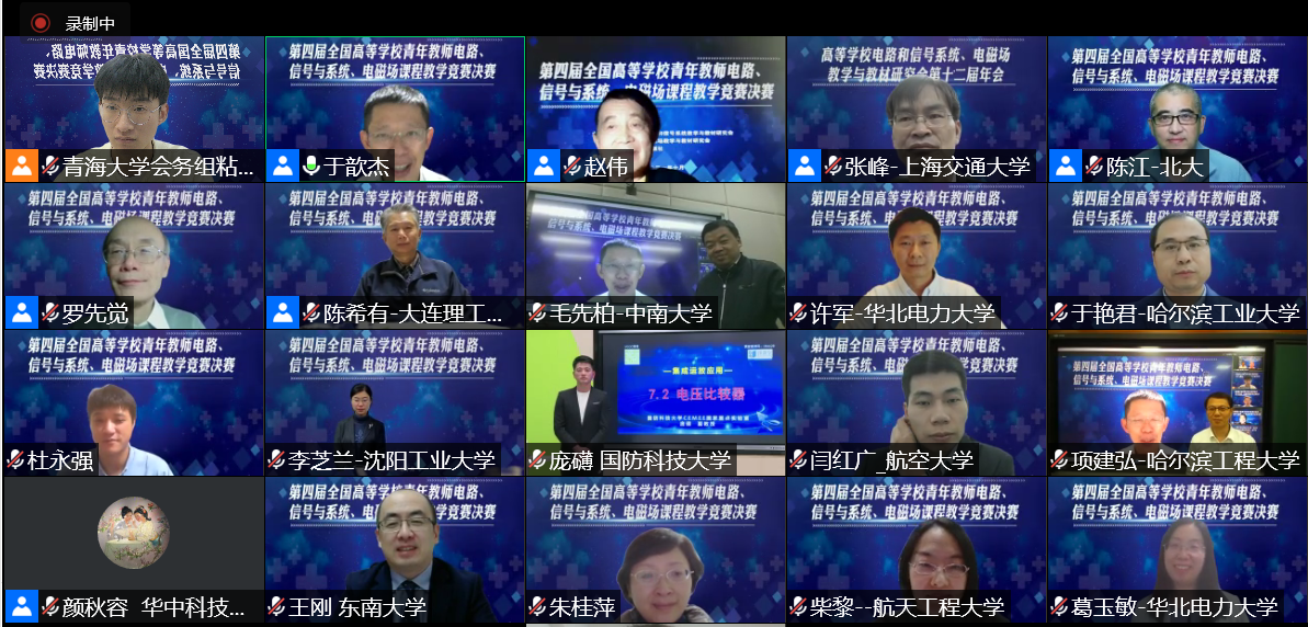 10月23日-24日,原定于青海西宁举办的第四届全国高等学校青年教师电路、信号与系统、电磁场讲课比赛,因为疫情原因,在线上举行。此次讲课比赛由高等学校电路和信号系统教学与教材研究会、高等学校电磁场教学与教材研究会和高等教育出版社主办,青海大学承办,整个比赛过程和专家点评过程全程直播,充分体现公开、公正、公平,是一次交流、学习、提高的盛会。来自全国各高校的36名教师晋级决赛,其中许军、葛玉敏两位教师获得电路组的全国一等奖。