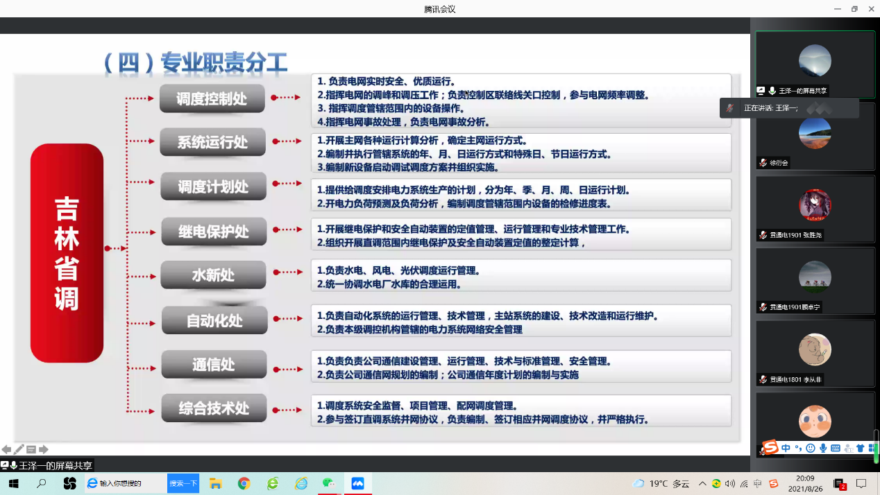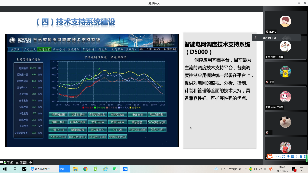 随后,王泽一处长讲述了调度运行专业从事的工作。通过生动地举例和比喻,结合东北电网的实际情况,形象地介绍了电网运行控制工作中需要解决的电力电量平衡问题,并就东北地区的新能源消纳问题讲述了解决方案和技术支持。王处长向同学们系统地介绍了省调的工作流程,结合了2020年吉林电网冰冻雨雪灾害事故,阐明电网事故的“三道防线”以及事故处理的原则和要求。并向同学们介绍了智能电网调度技术支持系统(D5000)等几个支撑电网调度员工作的技术平台。