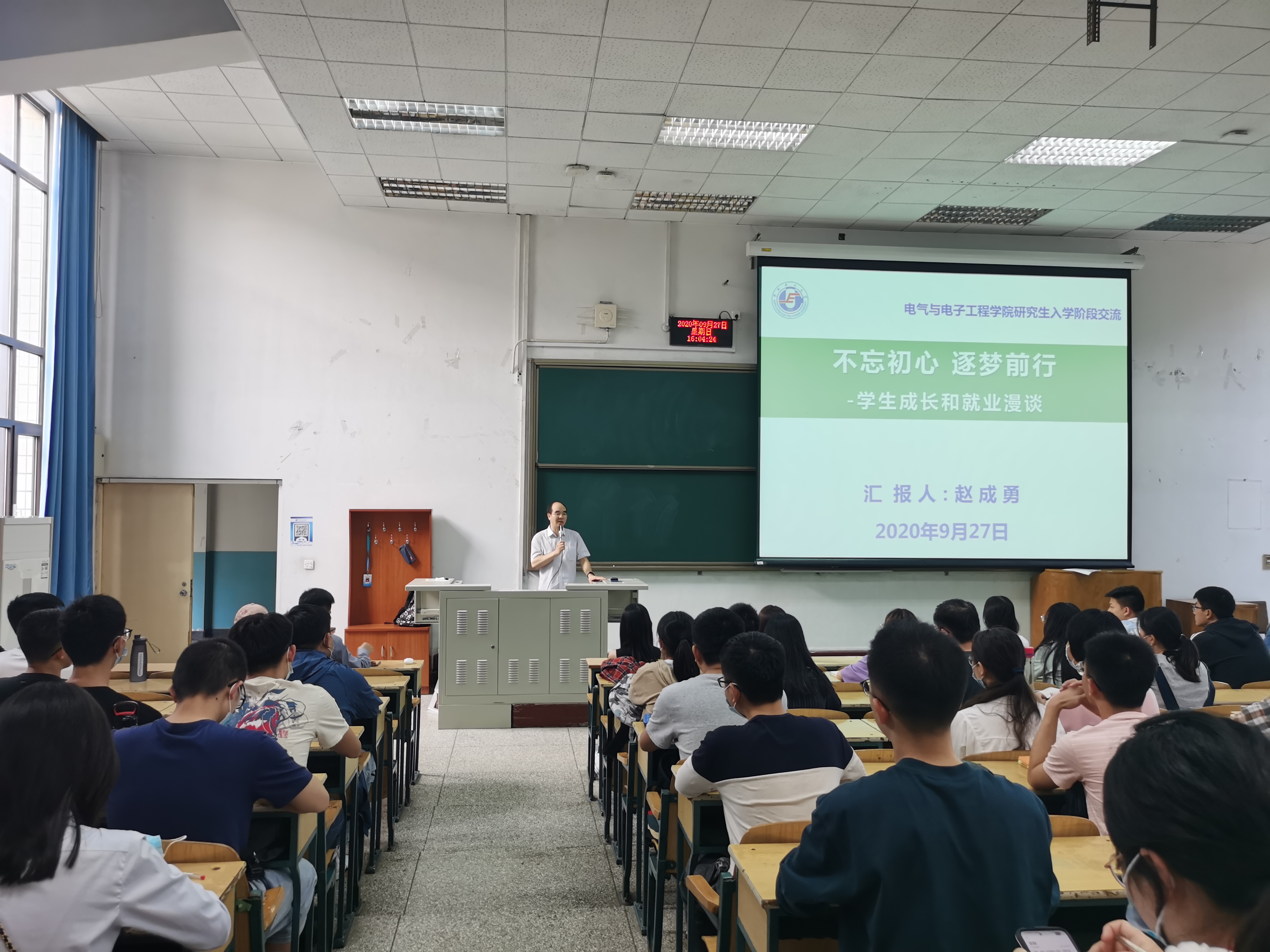 9月27日周日下午,为了更好的从一入学就对研究生新生的未来成长和就业发展做好积极的指引,世界杯体育官方网站特别邀请新能源电网研究所所长赵成勇教授在教一楼14阶梯教室,为2020级200余名研究生新生作了“不忘初心逐梦前行——学生成长和就业漫谈”的专题讲座。学院党委副书记王硕主持了讲座,2020级硕士生辅导员赵川参加此次讲座。