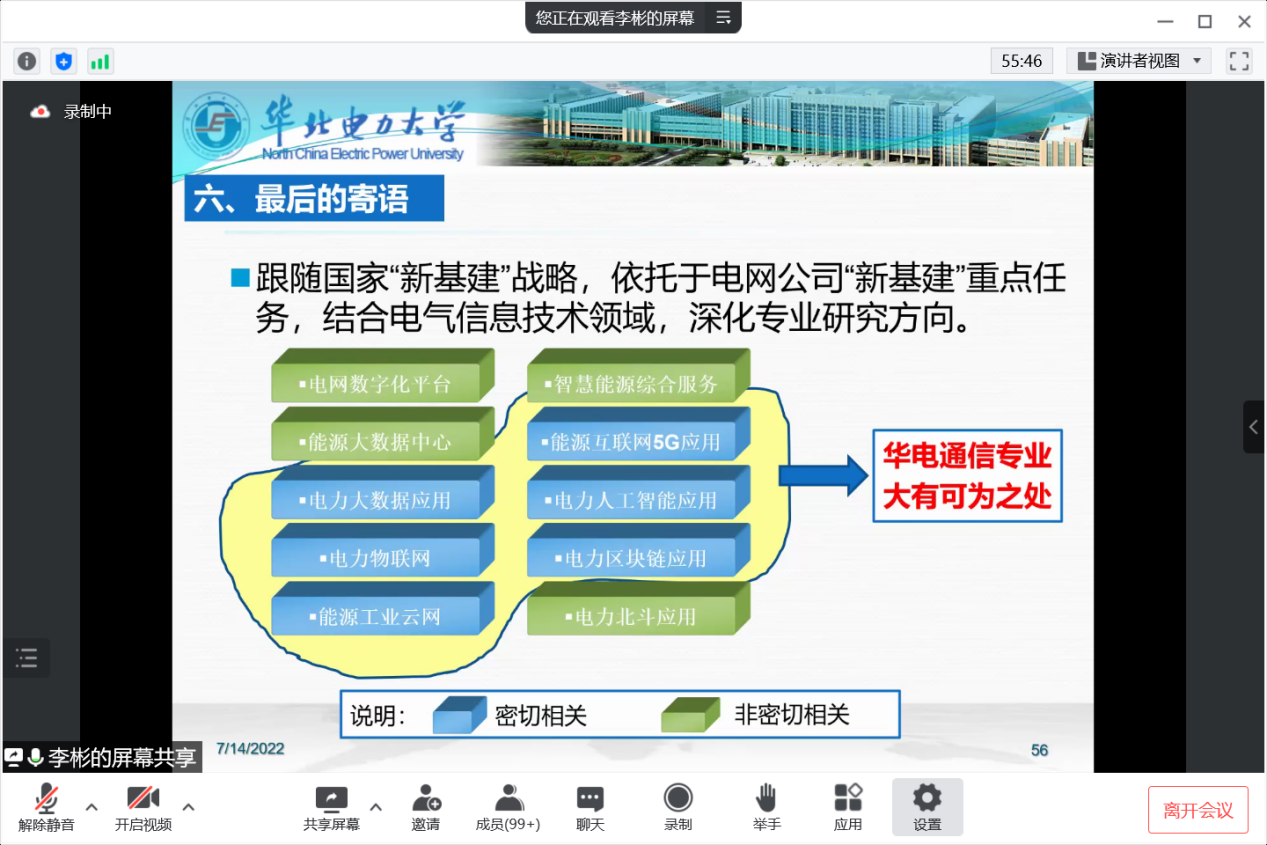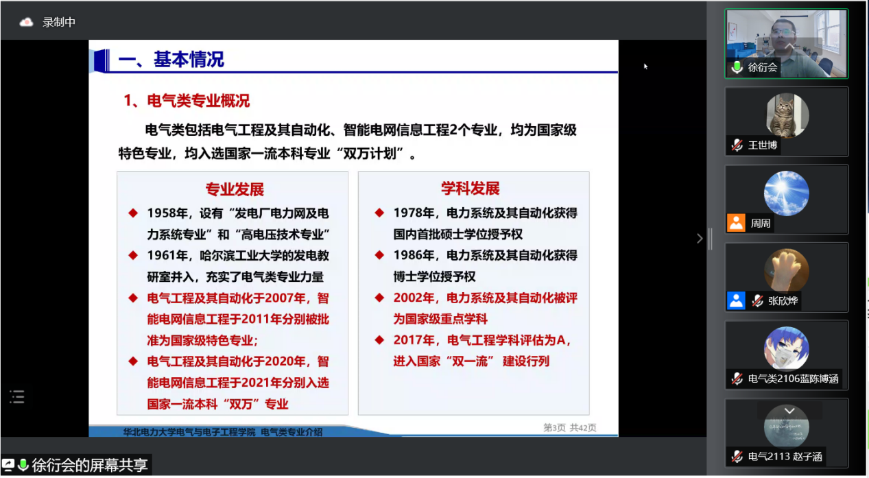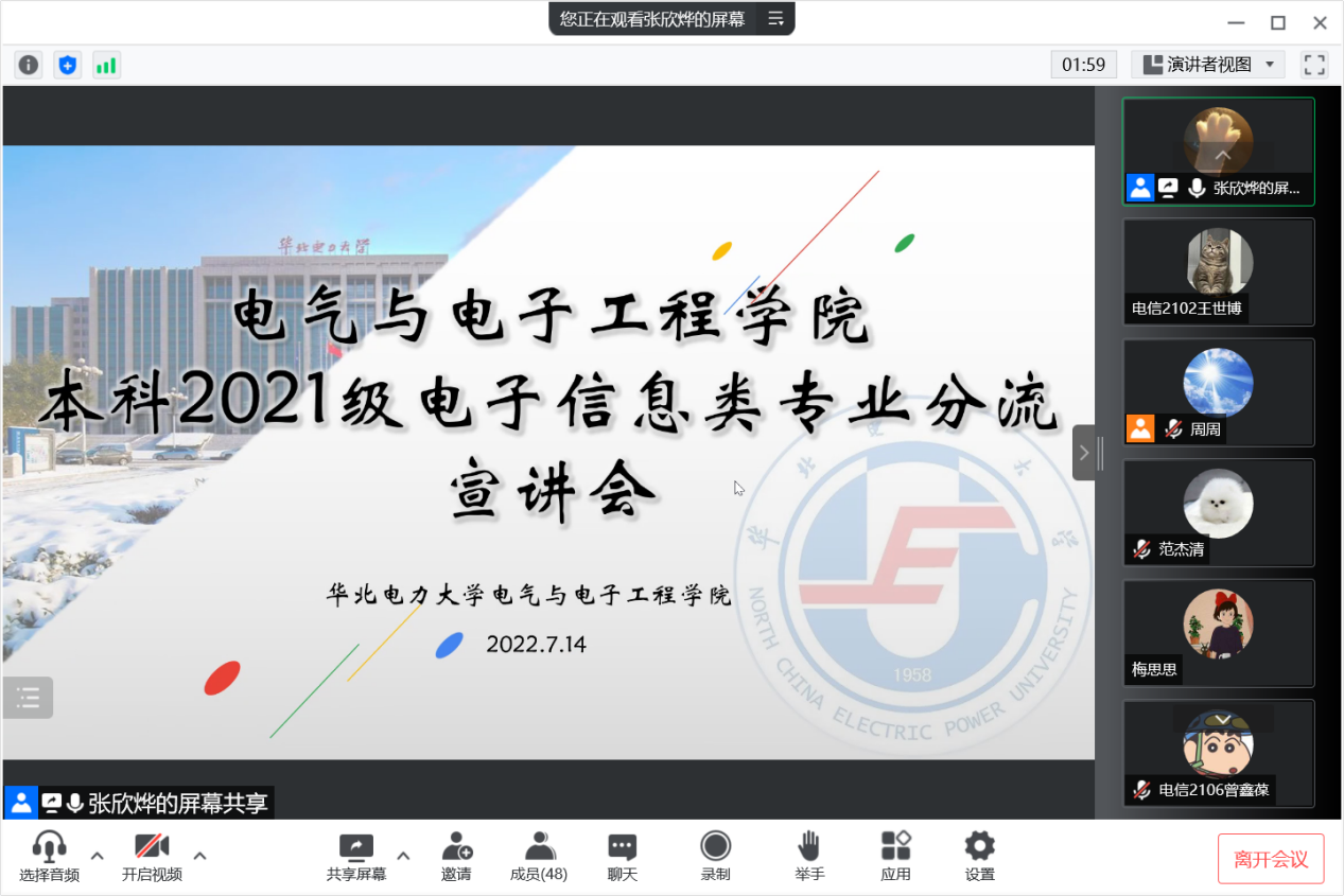 为落实大类专业招生和培养模式改革,帮助学生顺利完成从大类培养到专业培养的过渡,保障此次分流工作顺利完成,世界杯体育官方网站于7月14日14:00和19:00以线上形式召开电气类、电子信息类专业分流宣讲会。此次系列宣讲会议邀请了学院副院长徐衍会,学院党委副书记王硕,电信类专业优秀教师范杰清、廖斌、李彬,教学秘书王玲玲,辅导员张欣烨、周璟峰以及全体本科2021级电气类、电信类学生与部分家长参加。宣讲会由辅导员张欣烨主持。
