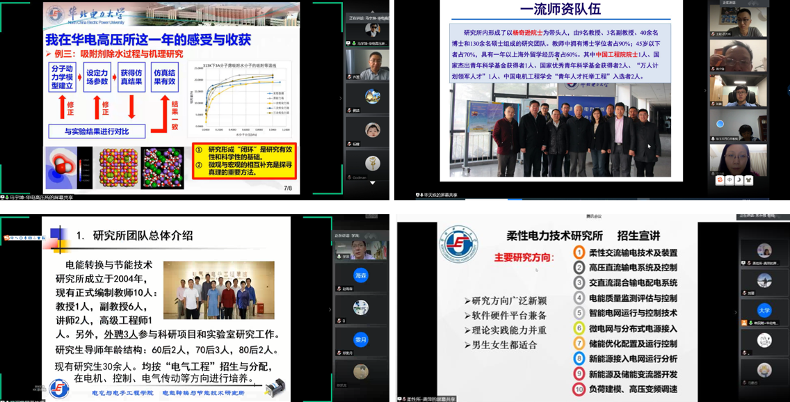 按照《电气学院2021级硕士免试推荐研究生招生宣传工作方案》安排,6月14日晚,电气学院首场线上推免研究生招生宣讲活动以腾讯会议方式举行,大学副校长、电气学院院长毕天姝主讲,校内外优秀学生近300人积极参与。毕天姝从发展历程、师资队伍、组织结构、人才培养、科研实力等方面对大学和学院作了详细介绍。并结合自身求学和工作经历,从一流的导师队伍、国内外领先科研平台与项目、持续的高就业率及完备的深造渠道、一流的奖助学金体系等七大方面介绍了学院的优势。活动还邀请2位青年教师代表和3位学生代表分别分享个人成长经历和学习体会,从导师选择、参与项目、培养模式等方面,介绍了在电院沃土中发展成长的优势,并与校内外优秀学生进行线上交流互动。整场活动讲解透彻、气氛活跃、互动热烈,全景展现了学院研究生工作的作为和风采。